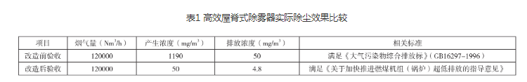 表1 高效屋脊式除霧器實(shí)際除塵效果比較